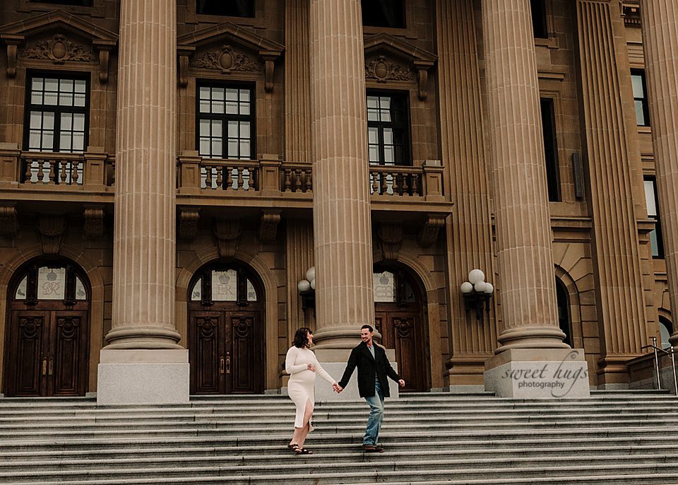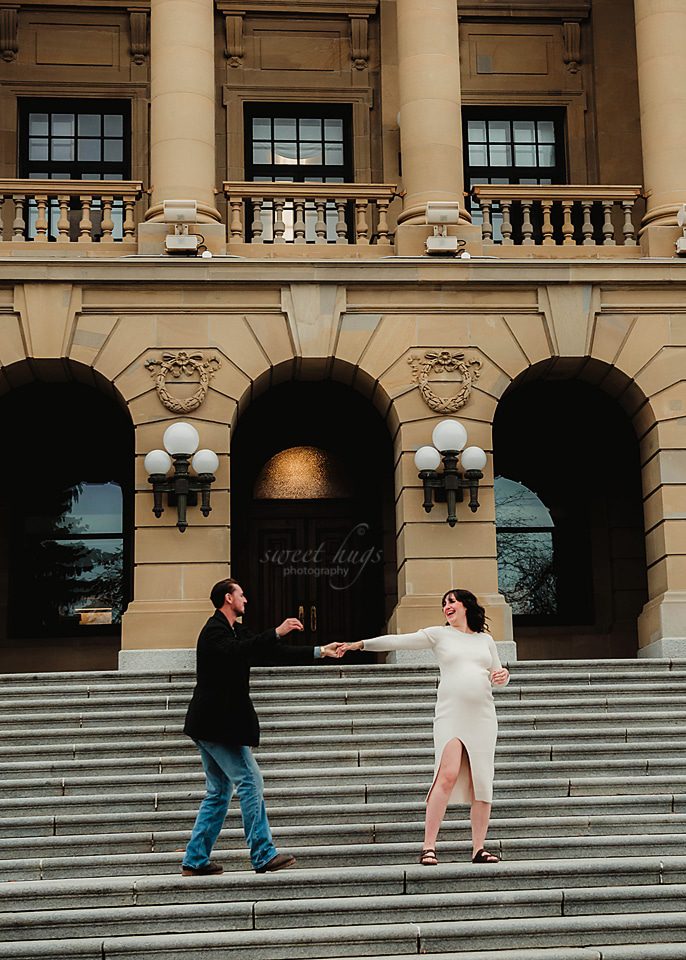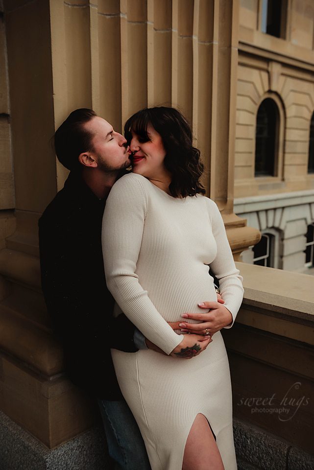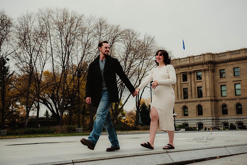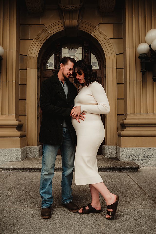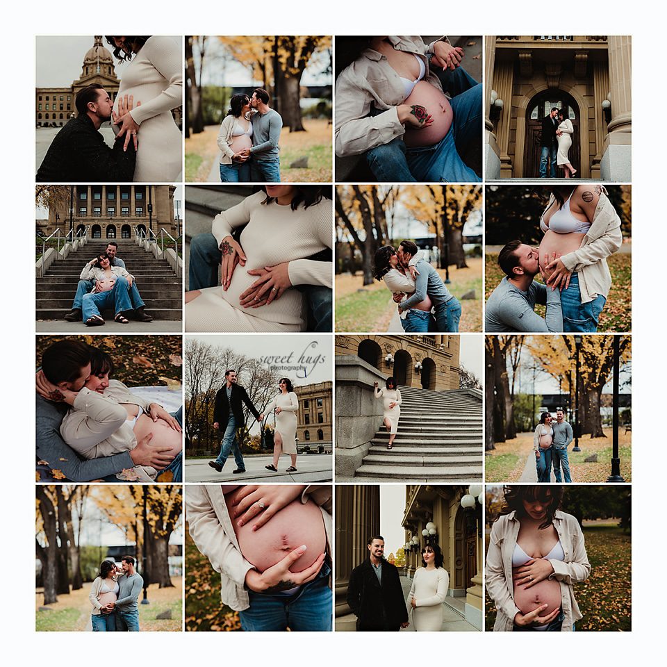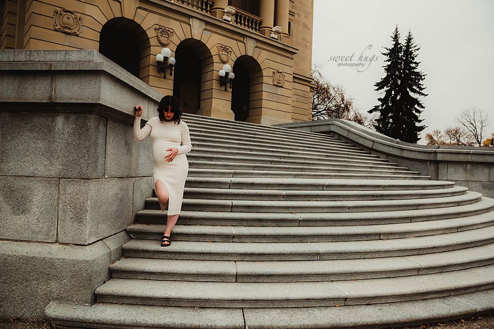So happy how this session turned out. This new Mama contacted me at the end of the Summer and requested having her session done at the Alberta Legislature Grounds. We were hoping for a beautiful sunset evening, but the day turned out to be cloudy and a bit chilly. When you come back from Summer to Fall weather, anything less then 15 degrees feels chilly.